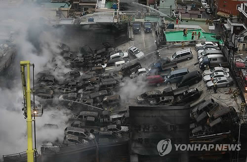 불길이 거세 중고 차량들이 주차된 철골구조물 2, 3층 중앙부가 내려앉았다.