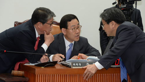국회 공무원연금개혁특별위원회 위원장인 새누리당 주호영 의원(가운데)이 6일 국회에서 열린 특위 전체회의에서 여야 간사인 새누리당 조원진(왼쪽)·새정치민주연합 강기정 의원과 대화하고 있다.