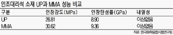 6일 한국화학융합시험연구원(KTR)에 따르면 UP의 성능이 MMA와 큰 차이가 없는 것으로 나타났다.