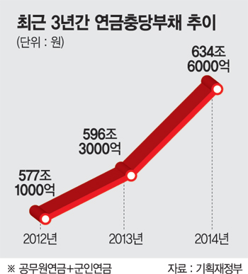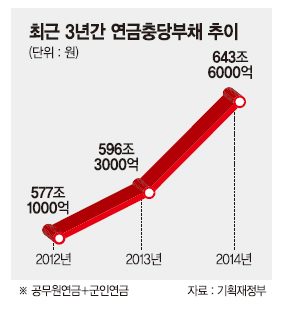 공무원·군인연금 충당부채는 지난 2012년 577조1000억원, 2013년 596조3000억원, 2014년 643조6000억원으로 매년 큰 폭으로 확대됐다. 특히 지난해 연금충당부채는 전년(19조2000억원 증가)보다 증가액이 두 배 이상(47조3000억원) 늘어났다. 기획재정부 관계자는 "공무원.군인 재직자가 125만3000명에서 126만3000명으로 9000명 늘어나고 수급자 수도 45만명에서 48만2000명으로 3만명 이상 증가했으며 공무원.군인 보수(임금) 인상률이 1.7%에서 3.8%로 된 게 영향을 미쳤다"고 설명했다.