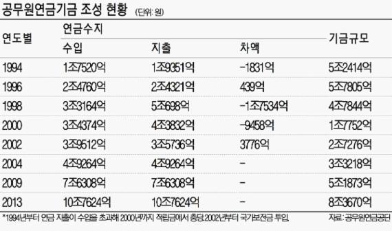 연금 지출규모는 2000년 4조3000억원에서 2013년 10조7000억원으로 6조원가량 급속히 증가하고 있는 것과 비례해 기금 규모도 같은 기간 1조7752억원에서 2013년 말 8조3670억원으로 6배가량 늘었다.