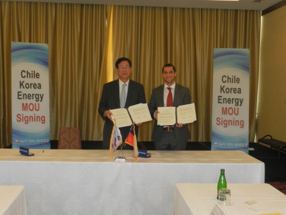 조환익 한전 사장(왼쪽)과 호세피자로 크리스티 칠레투자청장이 지난 22일(현지시간) 칠레 산타아고에서 열린 한전·칠레투자청 간 발전사 투자 협력 양해각서(MOU)를 체결한 뒤 기념촬영하고 있다.