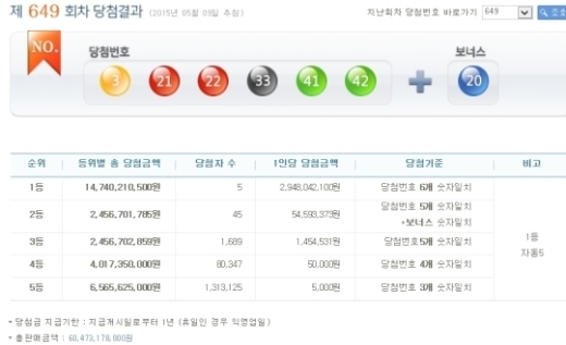 로또 649회 당첨번호 당첨금 지급기한은 지급개시일로부터 1년이며, 휴일이면 다음 영업일까지 지급된다./온라인편집부 news@fnnews.com