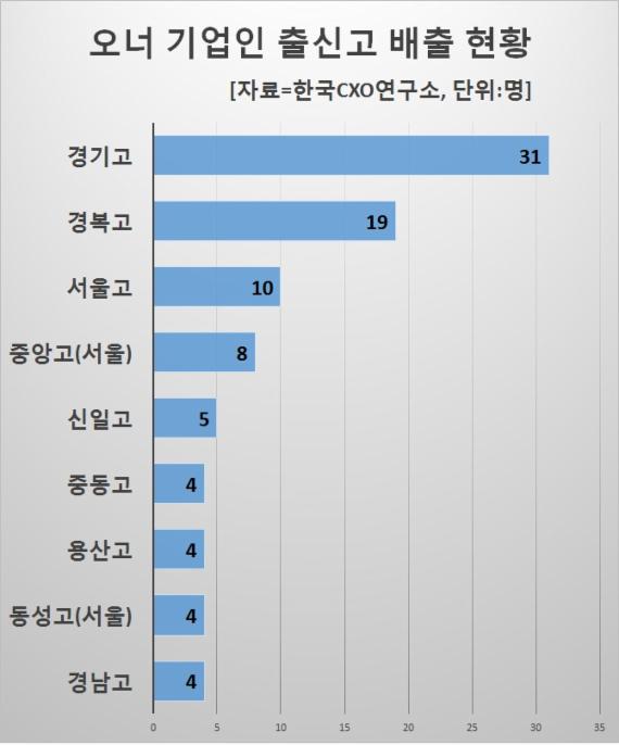 조사 결과에 의하면 국내 오너 기업가들을 가장 많이 배출한 고등학교는 '경기고(31명)'로, 2~3위 고교 출신 오너를 합한 숫자보다 많다.