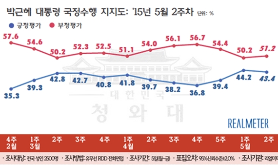 여론조사 전문기관 리얼미터는 5월 2주차 주간집계에서 박근혜 대통령의 국정수행 지지도는 1주일 전 대비 0.8%p 하락한 43.4%를 기록했다고 18일 밝혔다. ‘국정수행을 잘못하고 있다’는 부정평가는 1.0%p 상승한 51.2%였으며 ‘모름/무응답’은 5.4%였다.