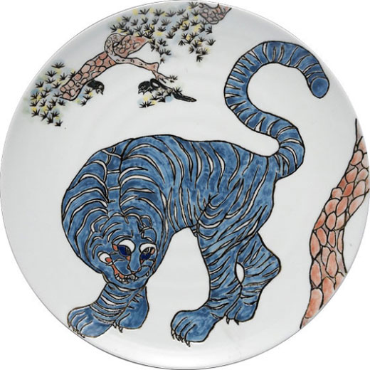 이번 전시에는 가로 4m, 세로 1m의 대형 작품 '소나무와 흰 호랑이'도 출품돼 눈길을 끈다. 32개의 도자기판을 이어 붙여 만든 이 대작은 네 마리의 흰 호랑이가 소나무 숲에서 뛰놀고 있는 장면을 포착한 것으로 고운 백색 도자 위에 표현해낸 호랑이의 형상이 호방하면서도 해학적이다. 전시는 오는 6월 21일까지. (02)3217-0232