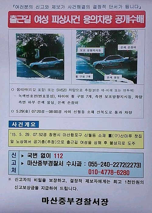 용의차량 공개수배출근길 여성 피습사건의 용의자가 검거돼 이목을 끌고 있다.경남 마산중부경찰서는 31일 살인미수 혐의로 김모(55)씨를 붙잡아 조사하고 있다고 밝혔다.김 씨는 지난 29일 오전 7시 52분께 창원시 마산합포구 한 주택가 도로에서 출근하던 A(26·여)씨에게 구경 5㎜짜리 공기총을 이용해 길이 10.13㎜, 무게 1.27g짜리 납탄을 쏘고 달아난 혐의를 받고 있다.당시 어머니와 함께 있었던 피해 여성은 얼굴 부위를 다쳐 당일 저녁 납탄 제거 수술을 받았으며, 다행히 생명에는 지장이 없는 것으로 알려졌다.김 씨는 피해 여성 어머니와 10년 전쯤 돈거래를 한 정황이 있는 것으로 드러났다.