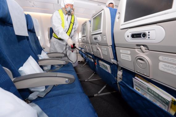 중동호흡기증후군(메르스)이 환자 수가 41명까지 늘어난 가운데 방역업체 직원들이 5일 오전 대한항공 인천 정비 격납고에서 대한항공 항공기 내부에 대한 소독·방역 작업을 하고 있다. /사진=박범준 기자