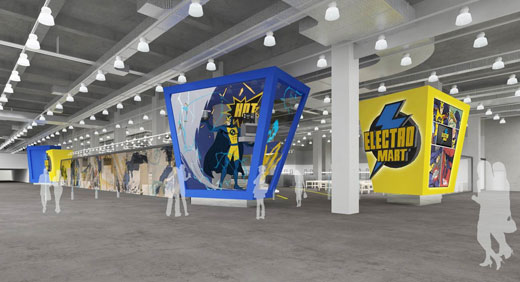 먼저 슈퍼맨, 베트맨 처럼 '일렉트로맨'이라는 히어로 캐릭터를 만들고, 해당 캐릭터를 매장 입구부터 벽면, 기둥등에 표현해 가족 단위 고객에게 흥미를 줄 수 있도록 했다.