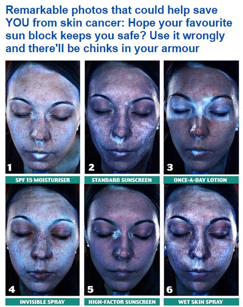 15일(현지시간) 영국 데일리메일은 최근 영국피부과전문의협회와 일부 전문가들이 여러가지 종류의 자외선 차단제를 바른 뒤 이를 자외선 카메라로 촬영한 사진을 공개했다.