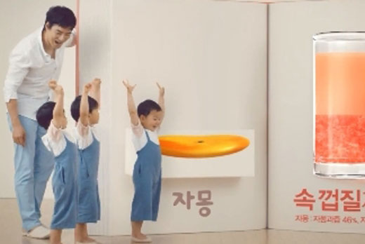 배우 송일국과 삼둥이 '대한, 민국, 만세'가 출연하는 코카-콜라사의 주스음료 '미닛메이드 홈스타일' CF(사진)가 대표적입니다. 송일국은 삼둥이들에게 "대한민국, 과즙만 마시는 건 다 마시는 게 아니에요. 정말 좋은 자몽 속껍질까지 다 먹어야 해요"라며 '미닛메이드 홈스타일'을 더 맛있게 먹는 법을 육아 고수답게 삼둥이들에게 다정하게 전합니다.