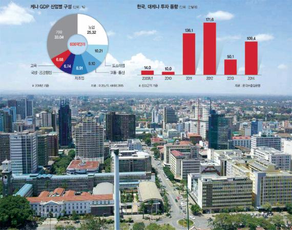 농업에 의존하는 산업구조에서 탈피하기 위해 제조업 인프라 구축에 적극 나서고 있는 케냐는 2014년 외국인 투자 105건, 총 10억6200만달러를 유치하며 국내 기업의 진출도 탄력을 받고 있다. 지난해 한국은 2개의 법인 투자와 85만달러의 실제 투자를 한 것으로 집계됐다. 국내 건설업체인 현대엔지니어링은 헬스게이트국립공원 내 올카리아 지열발전소 프로젝트도 수행, 올해 초 완공했다. 케냐 인구의 10%가 넘는 450만명이 거주하는 수도 나이로비 전경.