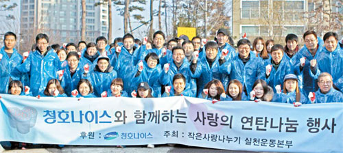 청호나이스(회장 정휘동)에는 사내 봉사모임인 ‘작은사랑 나누기 실천운동본부’가 있다. 창업 초기 몇몇 직원들의 선행에서 시작되었고, 이를 알게 된 정휘동 회장의 전폭적 지지 속에 현재는 청호나이스의 대표 동호회로 자리 잡았다. 매년 연탄 나눔 행사를 진행할 뿐만 아니라, 매월 정기적으로 양로원, 고아원, 장애인복지관 등을 후원하고 직접 찾아 일손을 돕고 있다.
