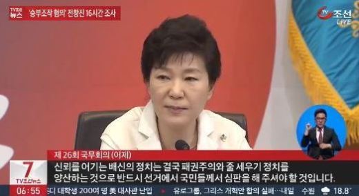 배신의 정치 심판박근혜 대통령이 국회법 개정안을 정부에 이송한 것에 대해 강한 불만을 드러냈다.지난 25일 박근혜 대통령은 국무회의에서 “이제 우리 정치는 국민을 중심에 두는 새로운 정치를 하는 정치인들만이 존재할 수 있도록 해야 할 것이다. 정치적으로 선거수단으로 삼아서 당선된 후에 신뢰를 어기는 배신의 정치는 결국 패권주의와 줄세우기 정치를 양산하는 것으로 반드시 선거에서 국민이 심판해주셔야 할 것”이라고 밝혔다.박 대통령은 그러면서 “우리 국민의 정치수준도 높아져서 진실이 무엇인지, 누구를 위한 정치를 하는 것인지 잘 알고 계실 것”이라며 “지금 우리는 오랜 침체에 빠진 경제에 활력을 불어넣고 일자리를 하나라도 더 만들어야 하는 절박한 과제를 안고 있다. 이제 국무위원들께서 자기 자리에서 소신 있게 국민을 위해 최선의 노력을 하실 때만이 나라가 바로 서고 국민의 삶이 나아질 것”이라고 강조했다.