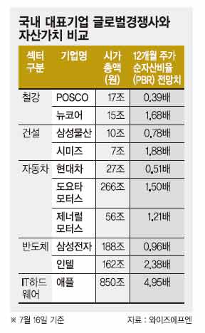 삼성전자와 반도체로 경쟁하는 인텔도 PBR가 2.38배다. 삼성전자와 인텔은 시가총액이 각각 188조8000억원, 162조9000억원으로 비슷하지만 주식가치는 큰 차이를 보인다는 분석이다. 현대차도 PBR가 0.51배에 머물러 있다. 국내 최고 자동차기업인 현대차가 청산가치의 절반 수준에 거래되고 있다는 의미다.