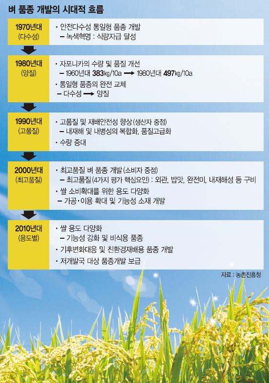 농진청 관계자는 "통일벼의 단점을 극복하기 위해 '유신', '밀양' 등 새로운 품종을 계속 육성하고 보급해나갔고, 무엇보다 80~90년대를 거치면서 수량성은 통일벼에 맞먹으면서 품질이 더욱 뛰어난 일반벼로 재탄생하는데 통일벼가 중심추 역할을 했다"고 전했다.