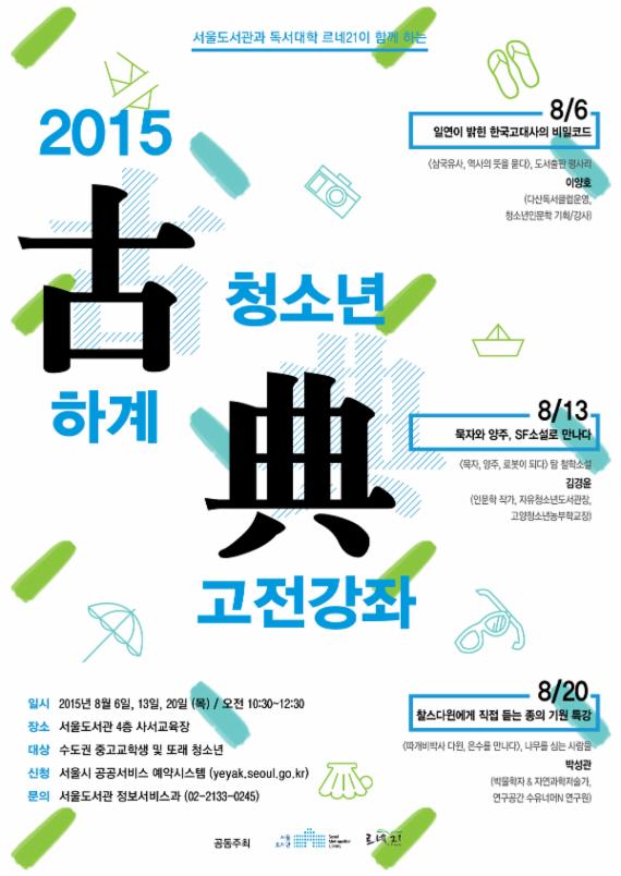 서울도서관은 8월 6일부터 8월 20일까지 목요일 오전 10시 30분부터 서울도서관 4층 사서교육장에서 '2015 청소년 하계 고전강좌'를 주제로 목요대중강좌를 연다고 31일 밝혔다.