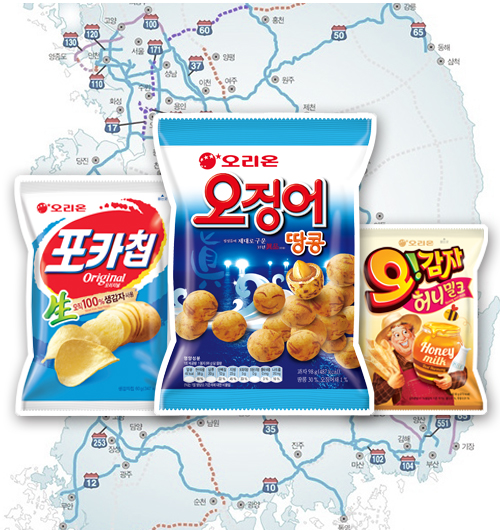 오리온 제품 중 여름 휴가철 전국 고속도로 휴게소에서 가장 인기 있는 과자는 '오징어땅콩'이었다.