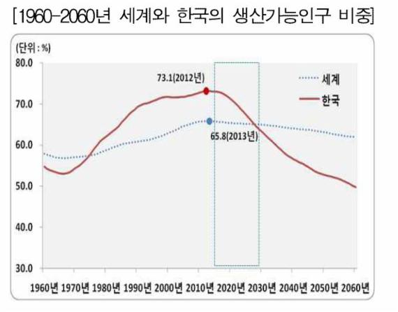 특히 경제성장의 버팀목 역할을 하는 생산가능인구는 인구 감소와 함께 심각한 위기에 직면할 수도 있을 것으로 보인다. 한국의 생산가능인구 비중은 2015년 73.0%로, 1966년(53.0%) 이후 계속 증가해 2012년 73.1%로 정점을 찍은 뒤 감소 추세다. 이에 따라 2030년에 63.1%, 2060년에는 49.7% 수준까지 낮아질 전망이다. 우리나라 생산가능인구 비중 순위는 1960년 106위에서 올해 10위까지 올라갔지만 2030년 115위, 2060년 199위로 추락할 것으로 보인다.