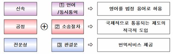 국제재판부는 재판 당사자 쌍방이 동의하는 경우에만 도입, 국내 기업이 불필요하게 불이익을 받을 가능성을 차단할 예정이다. 또 당사자 변론이 아닌 재판부의 소송지휘 등을 국어로 진행(영어 동시통역 제공)해 사법주권이 침해당할 우려를 제거할 방침이다.