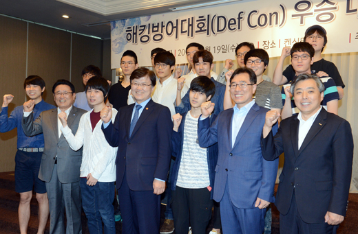 미래창조과학부가 19일 서울 국회대로 켄싱턴호텔에서 해킹방어대회(Def Con) 우승 대표단 환영식을 개최했다. 최양희 미래부 장관(앞줄 오른쪽 네번째)과 임종인 안보특별보좌관(앞줄 오른쪽 두번째), 유준상 한국정보기술연구원장(앞줄 오른쪽 여섯번째), 백기승 한국인터넷진흥원장(앞줄 오른쪽 첫번째)을 비롯해 해킹방어대회 우승 대표단 등이 기념촬영을 하고 있다.
