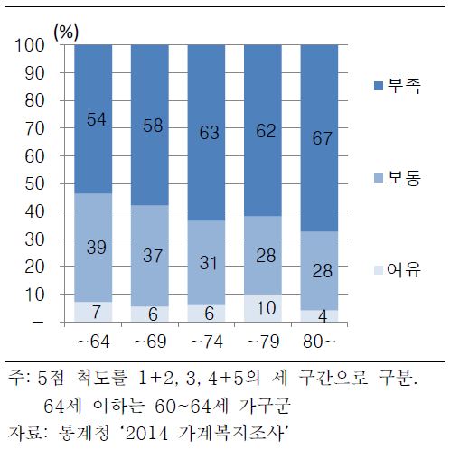 KB금융경영연구소 김진성 연구원은 “은퇴준비 정도가 잘되어 있다고 생각하는 가구는 10%에 불과했다”며 “60세 미만 가구 중 은퇴준비가 부족하다고 생각하는 가구의 평균 연소득은 4000만원 안팎으로 은퇴준비 보통 이상 가구의 소득에 비해 40% 이상 낮은 수준”이라고 말했다.