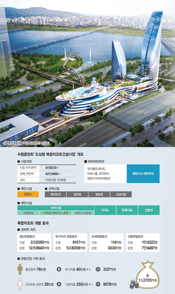 수협이 꿈꾸는 도심형 복합리조트는 노량진수산시장이 핵심이다. 현재 노량진수산시장이 현대화사업 새 건축물로 옮겨가면 1조2943억원을 들여 이 부지 4만8233㎡(1만4590평)에 지상 52층, 지하 6층(연면적 40만5686㎡) 규모로 복합리조트를 짓겠다는 계획이다. 여기엔 호텔과 컨벤션, 해양수산테마파크, 카지노, 쇼핑시설, 워터파크, 공연장, 멀티플렉스. 일부 업무시설 등이 조성된다. 이 중 해양수산테마파트(2만6000㎡)엔 관광객이 넓은 수조에서 직접 물고기를 잡을 수 있고 최신 정보통신(IT)기술이 들어간 3D화면에서 손 그림 물고기들이 유영하는 것을 관람할 수 있다.