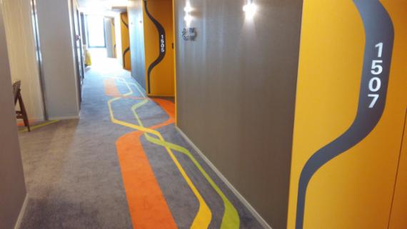 사진 5. 이비스 스타일 강남의 복도. 2호선, 3호선, 신분당선 노선 색상을 사용한 패턴으로 스타일리시함을 더했다.