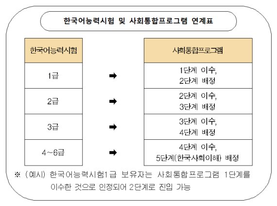 법무부는 한국어능력시험 등급(1∼4급)에 따라 사회통합프로그램의 '한국어와 한국문화' 1∼4단계를 각각 이수한 것으로 봐 교육과정을 단축할 수 있도록 했다.