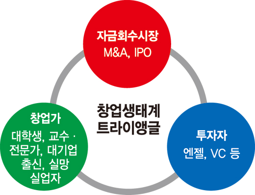 한국경제연구원 황인학 연구위원은 "전반적으로 기업가정신지수가 나아지고 있으나 여전히 선진국에 비해 낮다는 게 문제"라면서 "제도와 정책, 문화, 가치를 전반적으로 검토해야 건강한 창업생태계 구축을 위한 작업이 가능하다"고 지적했다. 이에 창업 전문가와 경영학계 일각에선 글로벌 기업으로 부상할 수 있는 혁신 스타트업의 창업생태계를 △창업자그룹 △투자그룹 △자금회수시장 등 트라이앵글 모델에 입각해 부문별 취약점을 파악하고 대안을 신중히 모색해야 한다는 목소리가 탄력을 받고 있다.