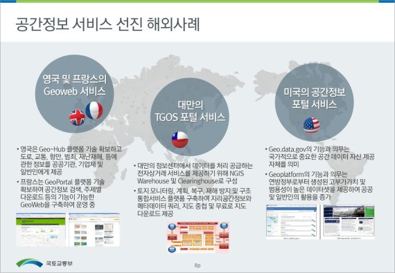 국토부는 설명회에서 '국가공간정보 관리체계 효율화에 따른 추진현황 보고'를 통해 3대 추진방향으로 △'국가공간정보 관리체계 개편'에 의한 국가공간정보 통합데이터셋의 정책적 지원 △66개 기관과의 양방향 정보제공 △포털 통한 민간개방 등을 제시했다.