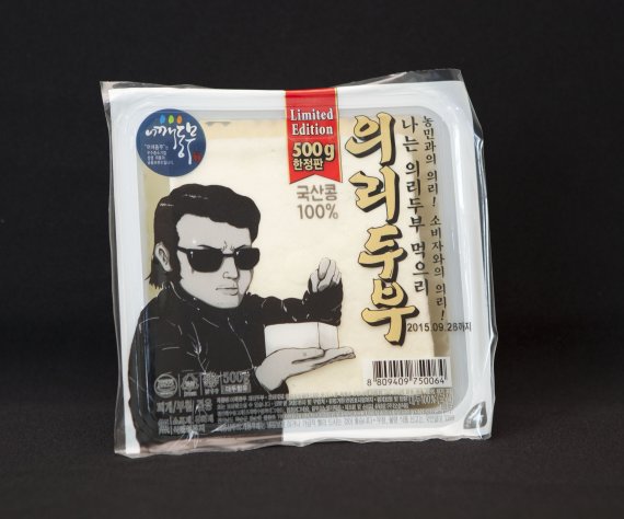 '의리 두부'의 상품 패키지는 남성적인 글씨체로 '의리 두부'라고 표기되며, 대한민국 의리의 상징 배우 김보성 씨의 캐릭터를 삽입한 것이 특징이다.