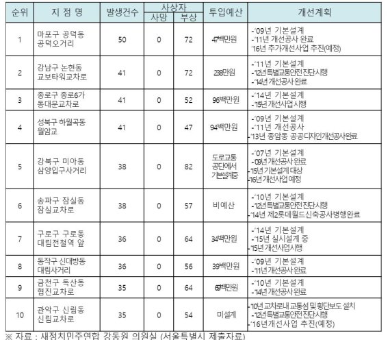지난해 서울시내에서 교통사고 발생 1위라는 불명예를 기록한 마포구 공덕오거리의 경우 2011년에 사고예방을 위한 개선공사를 완료했음에도 이같은 수치를 기록한 것이다. 또한 서울시가 2016년에 추가 개선사업을 추진할 예정이라고 밝히고 있으나 이곳을 지나는 운전자와 보행자는 계속해서 두려움에 떨 수 밖에 없다.