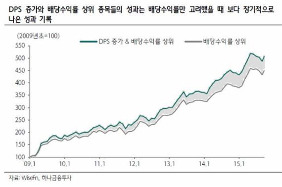 장희종 하나금융투자 연구원은 "배당주를 선택할 때, 배당금 증가와 배당수익률을 함께 고려하면 더 나은 성과를 기록한 것으로 확인된다"면서 "높은 배당수익률은 낮은 주가와 함께 배당금 증가의 조합이기 때문"이라고 말했다.