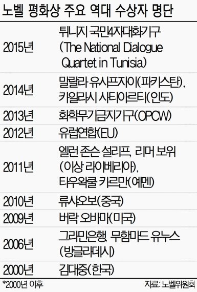 올해 노벨평화상은 예상 밖이었다. 9일(현지시간) 노르웨이 노벨위원회는 2011년 '아랍의 봄' 이후 튀니지의 민주화에 공헌한 '튀니지 국민4자대화기구'를 올해 노벨평화상 수상자로 결정했다.