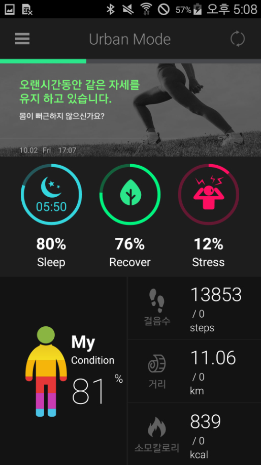 일상 생활에서 유용한 '어반' 모드는 사용자가 밴드를 착용하면 부착된 센서가 자동으로 수면, 피로, 스트레스 지수를 측정하고 이를 합산해 현재 컨디션을 숫자로 보여준다. 걸음수 및 이동 거리, 칼로리소모량, 수면 시간, 심박수 등은 별도의 조작 없이도 자동으로 기록된다.
