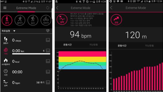 '익스트림' 모드는 등산, 걷기, 달리기, 자전거운동 중 선택할 수 있으며 스마트폰 애플리케이션을 통해 운동 거리, 칼로리, 심장 박동, 고도 변화 등을 알 수 있다. 또한 심박수의 변화를 그래프를 보여줘 워밍업 구간, 심폐강화 구간, 체지방연소 구간 등을 확인할 수 있는 것도 특징이다.