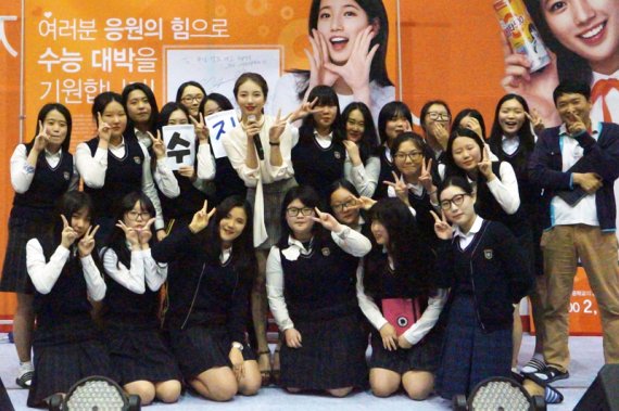 광동제약은 '고3 수험생 수능 대박 기원 프로젝트' 이벤트에서 1위로 선정된 부산 영도여자고등학교에 비타500의 광고모델인 미쓰에이 수지가 직접 찾아가 응원행사를 펼치는 깜짝 이벤트를 진행했다고 20일 밝혔다.
