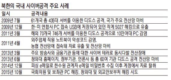 사이버사령부 발표에 의하면, 북한은 2010년부터 2014년까지 한국을 대상으로 한 사이버 공격을 6392번 시도했다.