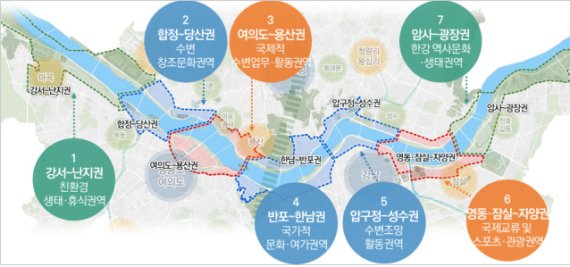 또 토지이용 측면에서는 7대 수변활동권역으로 나눠서 특화 육성하기로 했다. 7대 권역은 △강서-난지 △합정-당산 △여의도-용산 △반포-한남 △압구정-성수 △영동·잠실-자양 △암사-광장) 등이다.