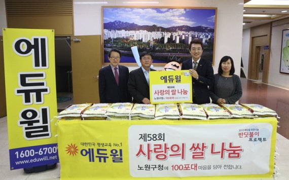 종합교육기업 에듀윌(eduwill.net)은 지난 29일 서울시 노원구에 '사랑의 쌀'을 기탁했다. 2011년 1월부터 시작된 에듀윌의 '사랑의 쌀' 나눔은 매월 꾸준히 진행되어 이달로 58회째를 맞는다.
