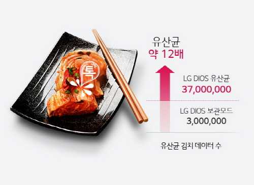 실제로 디오스 김치톡톡에서 김치를 일반 모드로 보관했을 때와 ‘유산균 김치+’ 모드에 두고 보관했을 때를 비교한 결과 유산균 수치가 무려 12배 차이가 나는 것으로 나타났다. 조선대 김치연구센터 측정치에 따르면 디오스 ‘유산균 김치+’ 기능을 사용한 김치는 유산균이 3,700만 마리(CFU:집락형성단위)로 일반모드에 둔 김치가 300만 마리인 것에 비해 12배나 높았다. 디오스 김치톡톡에 보관하는 것만으로도 맛있는 김치 유산균이 12배나 늘어나 공들여 담근 김장 김치를 더욱 건강하고 맛있게 먹을 수 있는 것이다.