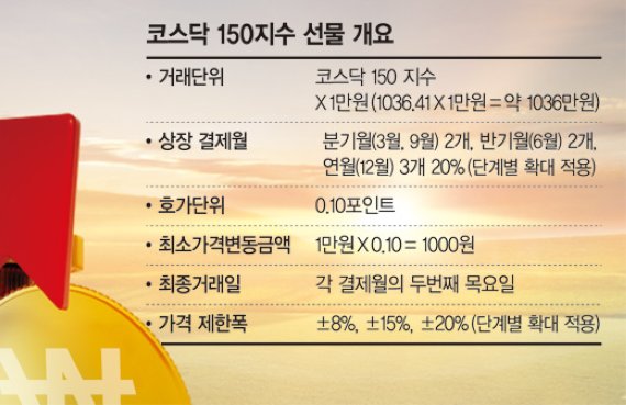 코스닥 시장에 새로운 대표지수선물인 코스닥150 선물이 상장된다. 기존 대표지수에 비해 코스닥 종합지수와의 상관도가 높아 기관이나 외국인 등 전문 투자가들의 헤지(위험관리)거래나 차익거래에 활용될 전망이다. 거래소는 상장지수펀드(ETF) 등 관련 상품 출시를 유도해 이를 시장에 안착시킬 계획이다.