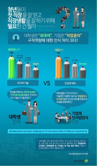 대학생들은 "취업을 위해 외국어 능력과 구직서류 작성능력 같은 구직 지식이나 기술이 더 필요하다"고 여겼고, 기업체 인사담당자들은 대학생들이 구직 지식이나 기술에만 치중하기보다는 "직업윤리나 도전정신 같은 인성과 태도를 갖추는데도 초점을 맞춰야 한다"고 생각했다.