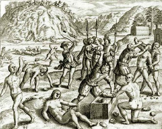 아라와크족이 보유하던 금 장식품들은 멕시코로부터 유입된 것일 뿐 히스파뇰라섬에는 금이 별로 없었다. 그럼에도 불구하고 스페인 침입자들은 원주민들에게 일정량의 금을 주기적으로 바칠 것을 강요했다. 초기에는 자신들이 보유하고 있던 금을 바쳤지만 더 이상 금을 구할 수 없게 된 원주민들에게는 잔인하기 짝이 없는 형벌이 가해졌다. 원주민들의 손목을 잘라버렸고, 손목이 잘린 인디언들은 서서히 죽어갈 수밖에 없었다. 콜럼버스의 만행이 두려워 카사바라는 독성식물을 먹고 자살을 선택하는 원주민도 많았다. 라스 카사스의 기록에는 콜럼버스가 예쁜 원주민 여자들을 납치해 선원들에게 성노리개로 선물했다는 사실도 포함돼 있다. 스페인인들은 칼의 성능을 시험한다면서 살아있는 인디언의 몸을 토막 내는 짓까지 서슴지 않았다는 기록도 있다. 1494년 라스 카사스가 처음 왔을 땐 300만명이 넘던 아라와크족이 1508년에 다시 왔을 때는 6만명 정도밖에 남아 있지 않았다고 한다.