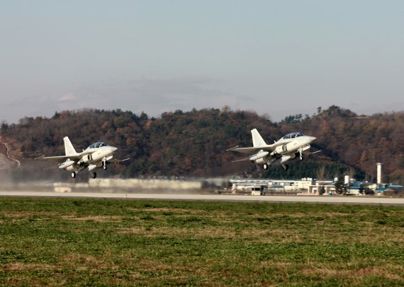 한국항공우주산업이 필리핀에 직접비행으로 납품하기로 한 국산 전투기 FA-50PH가 27일 오전 경남 사천 비행장에서 이륙하고 있다.