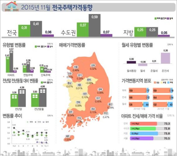 한국감정원은 11월 전국주택가격동향조사를 실시한 결과 지난달 대비(10월 12일 대비 11월 9일 기준) 매매가격은 0.31%, 전세가격은 0.41% 상승, 월세가격(월세, 준전세, 준월세 포함)은 0.06% 상승한 것으로 나타났다고 11월 30일 밝혔다.
