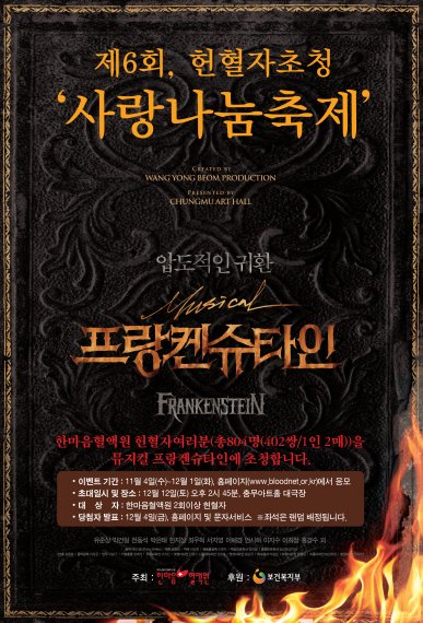 한마음혈액원은 오는 12일 충무아트홀 대극장에서 제6회 헌혈자초청 '사랑나눔 축제'를 통해 뮤지컬 '프랑켄슈타인'에 헌혈자와 관계자 약 1154명을 초청한다고 밝혔다.
