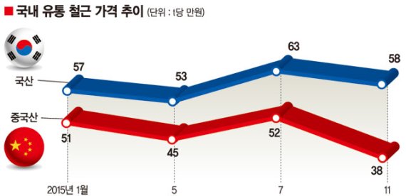 다량으로 유입된 중국산 철근은 가격도 급격히 싸졌다. 올초 51만원을 보였지만, 지금은 40만원을 밑도는 것으로 알려졌다. 반면 국내 철근가격은 올들어 오름세를 보였다. 국산 철근은 5월 53만원으로 저점을 찍고 7월 63만원에 유통됐다. 하지만 최근 중국산의 파상공세로 유통가는 57만∼58만원선을 보이고 있다. 내린 가격이어도 국산은 중국산에 비해 20만원선 높은 금액이다.