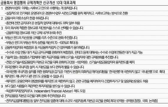 금융위원회는 3일 이 같은 내용의 '금융회사 영업행위 규제개혁안'을 금융개혁회의에서 심의.확정하고 '신규 개선 10대 과제'를 발표했다.